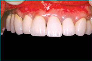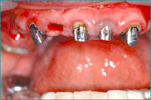 4本の歯を利用して上顎に6本のインプラントを入れる。 審美性の回復を目指す。